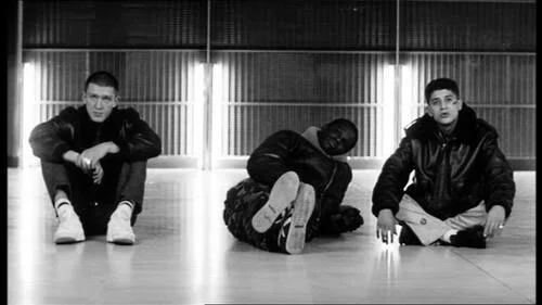 While following these three comrades on their daily routine through the banilue , a sense of community and relative security is established. They amiably greet many of their friends, also ethnically heterogeneous, shown to be at home in their environment, with varying degrees of satisfaction. Hubert, for instance, believes the only way to improve his life is to improve the poverty-stricken banilue , while Vinz believes it can’t be improved. Vinz is shown to be a product of his environment— he often compares himself to others, choosing jail over community service because “everyone has done time.” He is influenced by the hardship around him, and by movies themselves— many American films are mentioned, he mimics Travis Bickle, and ducks into a movie theater at one point to gain some respite.